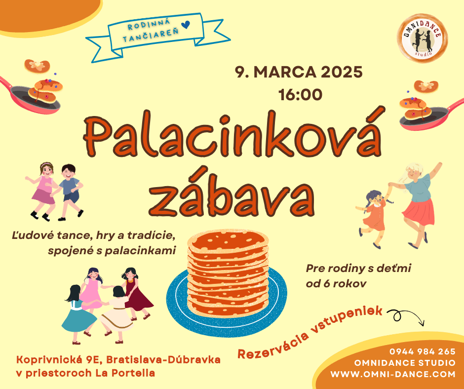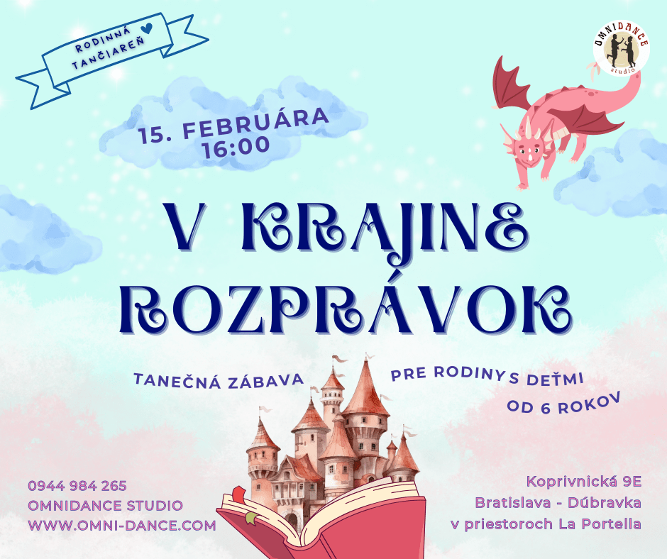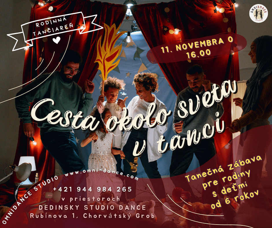 Rodinná tančiareň je séria podujatí pre rodiny s deťmi od 6 rokov. Čakajú na vás tance z rôznych krajín, zábavné hry a dokonca aj súťaže. Ak radi trávite čas spolu s rodinou a radi sa učíte niečo nové, príďte k nám. Je to u nás zábavné, zaujímavé a srdečné.